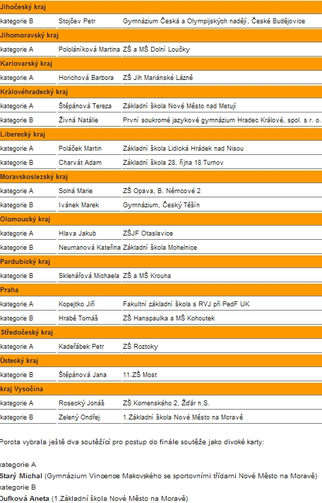 KRAJSKÝCH KOL (žáci postupující do celostátního kola):