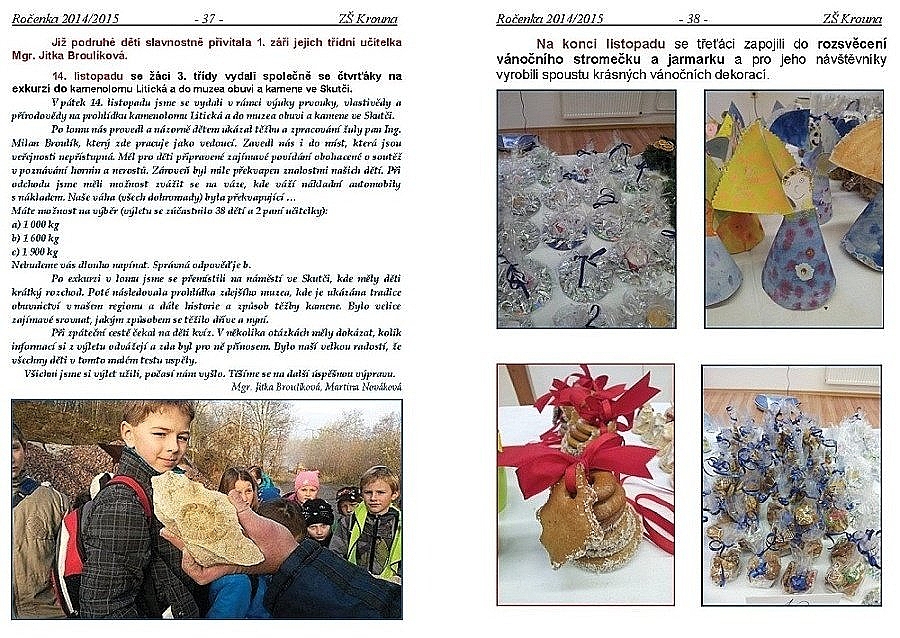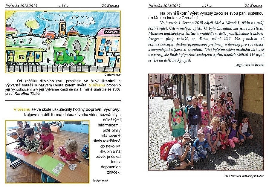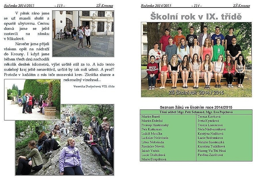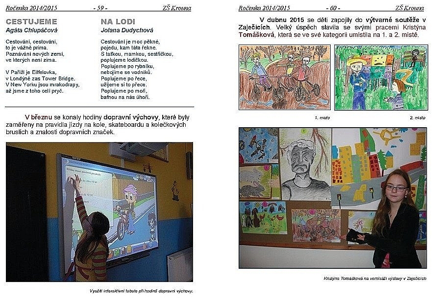 stránkách ročenka zachycuje dění ve škole v uplynulém školním roce, přináší
