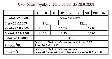 22. - 26.6.2009 žákům zkráceno vyučování dle následujícího rozpisu: