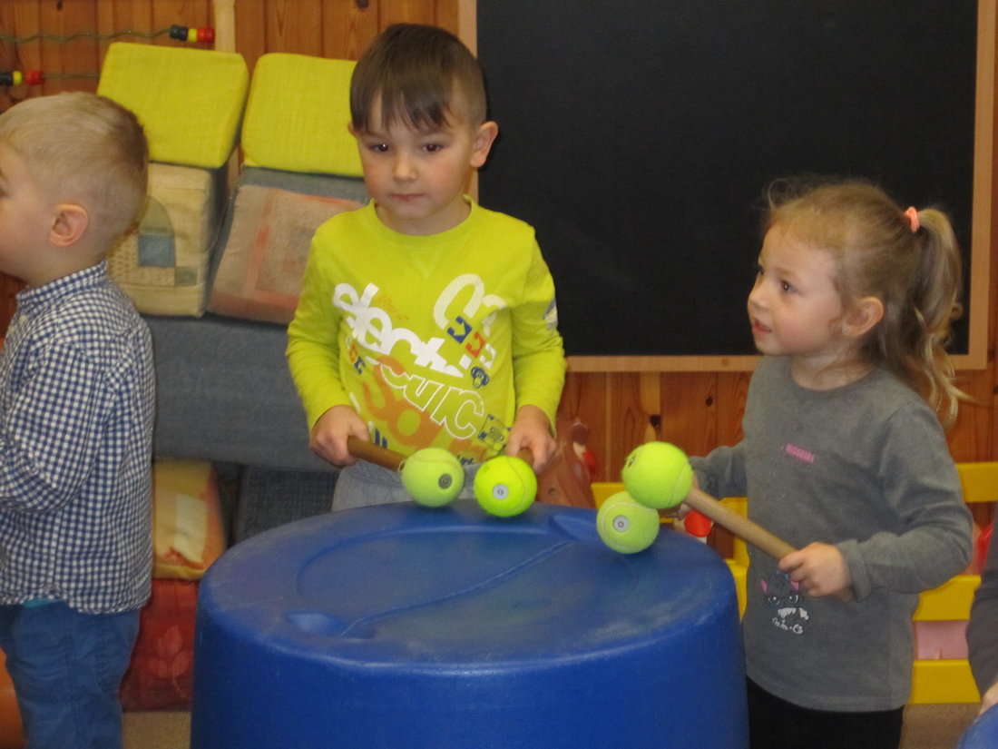 V úterý dne 27.3. nás navštívil pan David Andrš se svou bubenickou dílnou. Zjistili jsme, že hrát se dá na úplně obyčejné věci jako jsou plastové sudy a staré hrnce nebo chrastítka vyrobená z plechovek. Jako paličky dobře poslouží dřívka zakončená tenisovým míčkem. Hrát se dá ale i úplně bez pomůcek- stačilo tleskání, dupání a pleskání na různé části těla (rozdílné zvuky vydává pleskání na hrudník, břicho, nafouknuté tváře apod.). Formou velice zábavné hry se tak děti učily akcentům, gradacím, bodydrummingu, pomocí rytmického slabikování a popěvků se naučily pár rytmů. Užili jsme si spoustu legrace, uvolnili se, zbavili se přebytečné energie a hlavně jsme zjistili, že všichni můžeme být muzikanti!