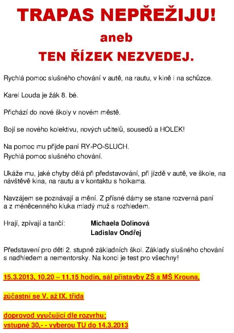15. března se ve škole uskutečnil program známé herečky a moderátorky Michaely Dolinové a herce Ladislava Ondřeje zaměřený na zásady společenského chování.